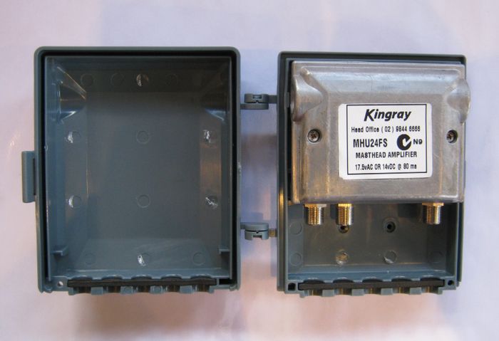 F type masthead designed to amplify UHF antenna and diplex a separate VHF antenna or amplify the UHF component of a combined antenna. Has LTE SWITCHABLE FILTER HAS SHIELDED METAL CASE Power supply sold separately